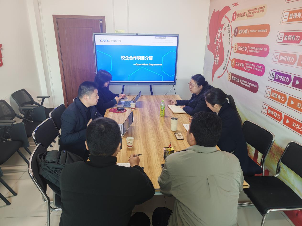为深入贯彻产教融合、协同育人理念,精准对接新能源产业人才需求,11月17日,宁德时代新能源科技股份有限公司运营中心校企合作经理张艳婷、主任工程师韩红攀一行专程到访我校新型能源学院,就校企合作模式创新、人才联合培养等事宜开展专题座谈。新型能源学院党总支副书记冯帅、副院长黄俊梅,新能源教研室主任刘敏及骨干教师商伟超热情接待并出席座谈,会议室里氛围热烈融洽,双方围绕合作议题畅所欲言、深入交流。