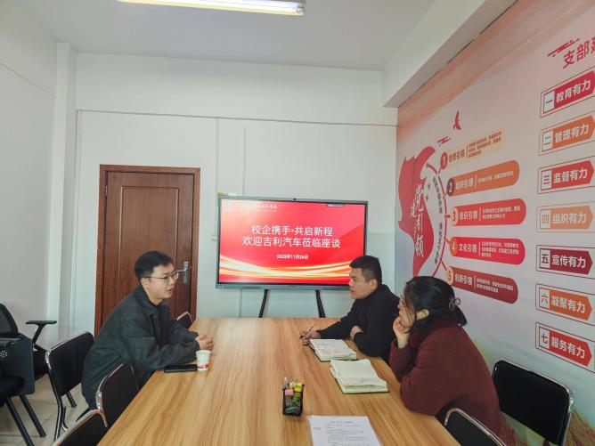 2025年11月26日,新型能源学院与吉利控股集团召开校企合作专题磋商会议,精准对接新能源汽车产业链发展需求,深化产教融合与人才培养协同。吉利控股集团校企合作部负责人周煜带队交流,学院教学办主任王茜、骨干教师商伟超出席会议,围绕订单班培养等核心议题达成初步合作共识。