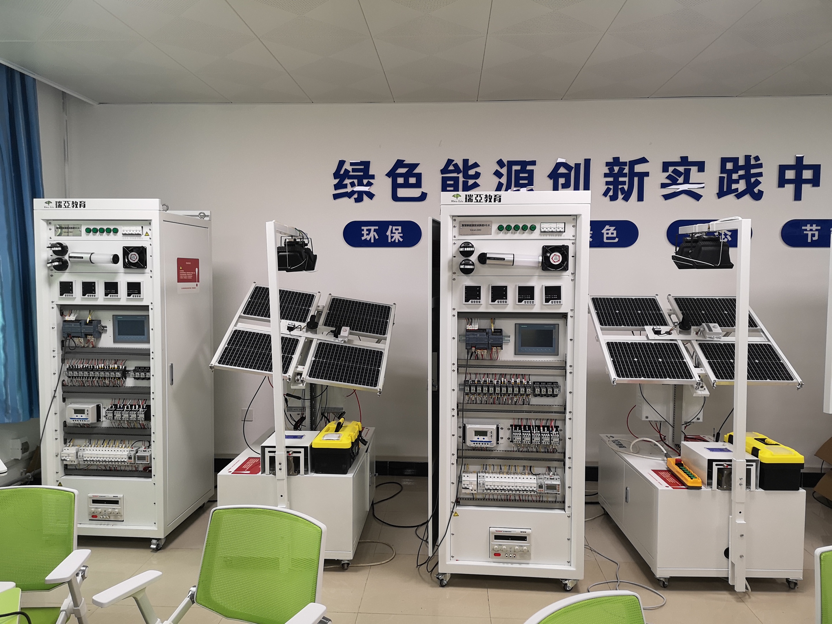 绿色能源创新实践中心是集教学、实训、科研于一体的新能源装备系统实训平台,主要面向新能源装备技术、电气自动化技术、储能技术等新能源相关专业。中心现有3套新能源装备系统,分别是1套风光互补电力系统和2套光伏发电系统。这三套实训系统均能用于新能源发电系统研发、设计、制造、装配、调试和维修等实操,同时配套使用智能发电系统设计软件和智能配电规划软件,可实现“源、网、荷、储”全系统的实操,使得教师能够将教学环境与现场工作环境相结合,学生能够将理论知识与实际操作相结合,兼具教师教学能力提升和学生综合职业能力的双重功效,从而为新能源相关专业的发展和新能源产业的发展提供强力支撑。