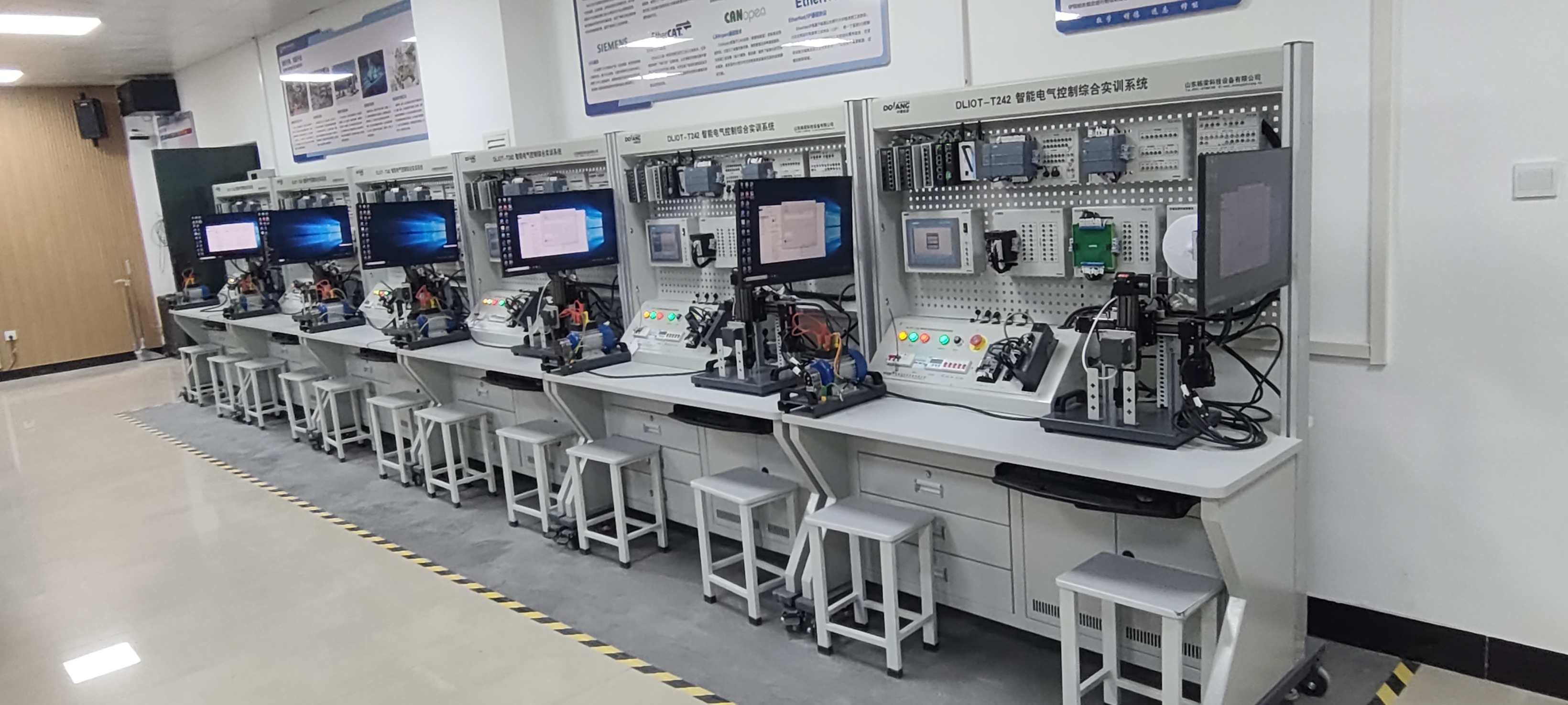 实训室仪器设备主要包括:工业网络硬件架构单元、工业控制单元、工业互联网生成执行单元和工业互联网平台。能够开展PLC数据处理与功能指令应用、变频器运行控制与参数设置、工业触摸屏组态与监控界面设计、工业交换机配置与车间网络规划、自动生产线控制系统编程与调试、数字孪生仿真模型构建与调试等实训项目。