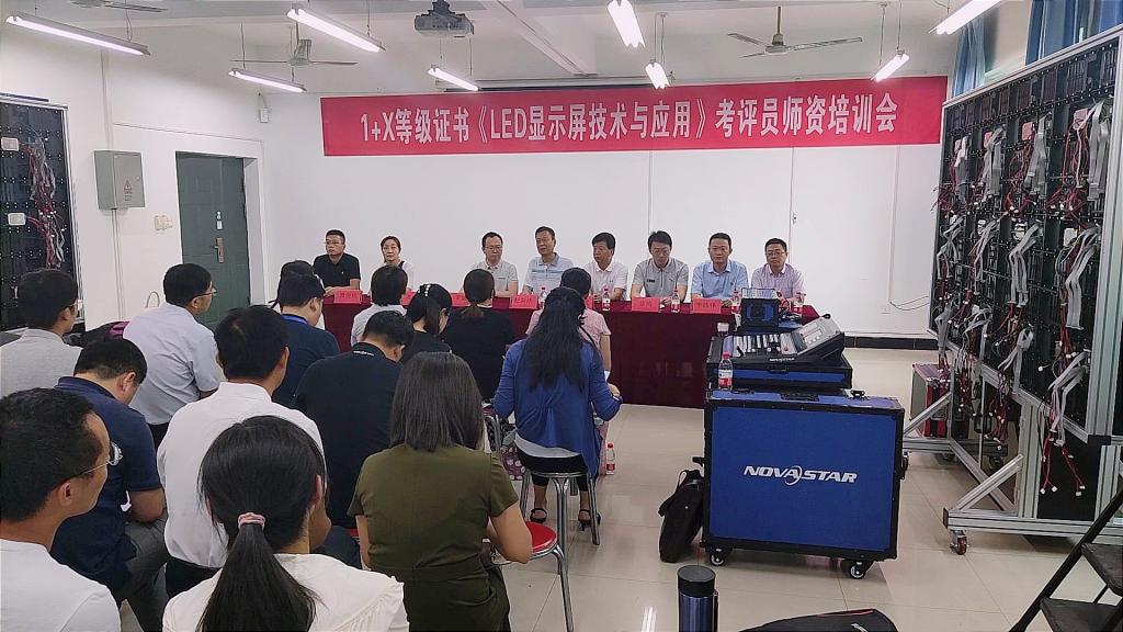 为深入贯彻国务院《国家职业教育改革发展实施方案》文件精神,全面落实《关于组织开展1+X证书制度试点院校教师培训的通知》的要求,2021年7月2日上午8点半,“1+X”技能等级证书《LED显示与应用》考评员师资培训班于在学校实训楼LED显示技术实验室顺利开班,来自陕西省8所中高职院校18名教师参加培训。