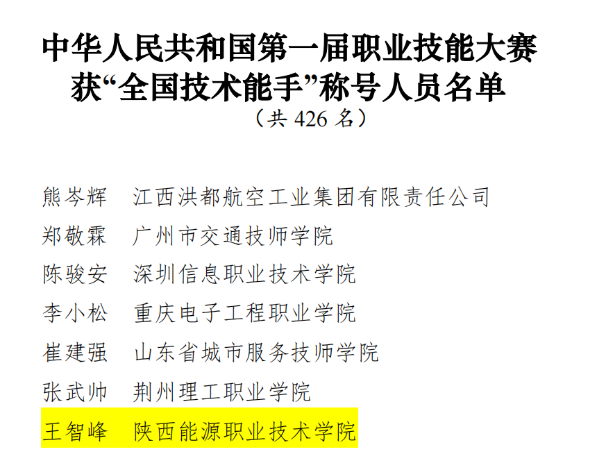 2020年12月,陕西能源职业技术学院智能制造与信息工程学院电气18级学生王智峰代表陕西队参加中华人民共和国第一届职业技能大赛“光电技术”赛项,取得了“光电技术”赛项全国第五名的优异成绩,获得优胜奖,晋升技师,被授予“全国技术能手”的荣誉称号,并成功入选“光电技术”赛项国家集训队(全国前十名)。