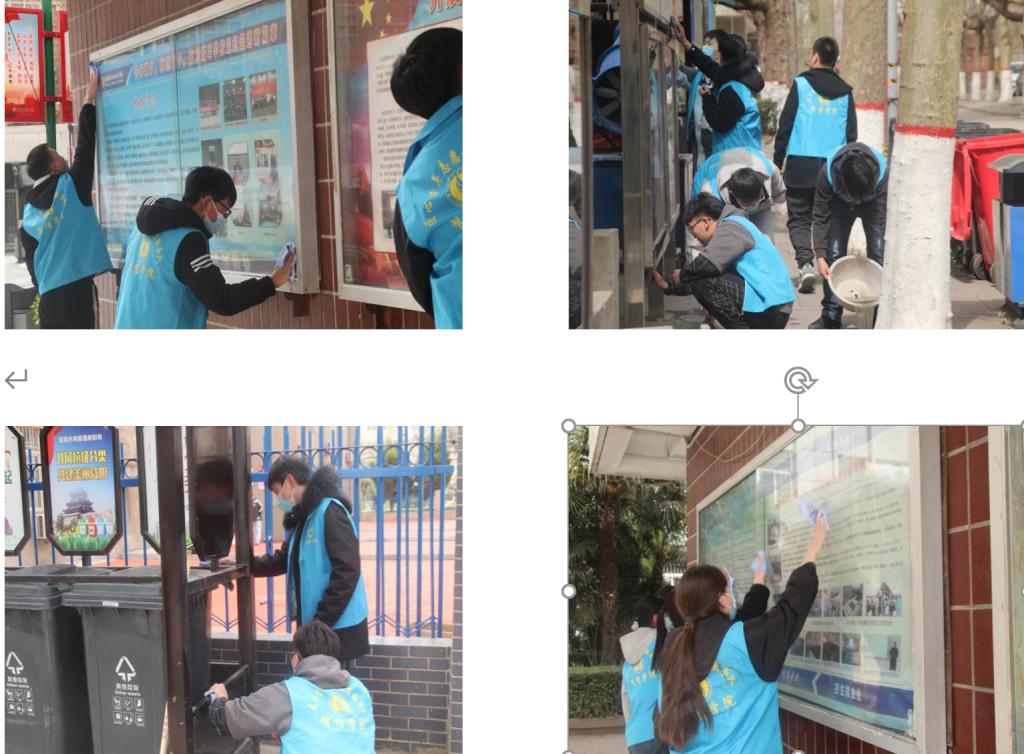 3月7日中午,志愿者们携带自己的清洁工具,在教学楼门口集合后,大家分工合作,有条不絮,开始美化校园活动。他们有的清洗展览板,有的打扫卫生,有的清理死角垃圾,一会儿使校园各处变得干净整洁。