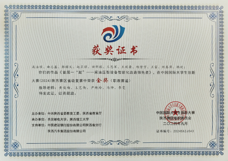 大赛自启动以来,学院高度重视,开展专题培训,组织200余个团队报名参赛。经过院级线下初赛打磨、校级路演答辩推荐和省级决赛评审,由黄俊梅老师团队提出的首屈一“趾”—采油压裂装置智能化改造领先者项目经过层层选拔在大赛中脱颖而出,斩获陕西省赛职教赛道金奖、产业赛道铜奖,黄俊梅荣获“受表扬指导教师”荣誉称号;尹艳玲老师团队提出的智能平安——基于UWB定位技术的智能矿灯集成系统项目以及王艳蓉老师团队提出的“智”根知底--智能电位检测分析系统项目分别获得陕西省职教赛道银奖。
