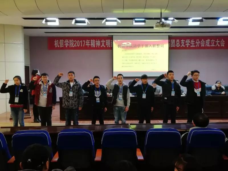 随后表彰结束后,进行本次活动的第二个环节,团总支学生分会成立大会过程中刘浩书记为匠心志愿服务队进行授旗,各老师为机信学院全体团学干部授牌,授牌结束后在机信学院团总支书记景安琪老师带领下全体团学干部进行入职宣誓,他们将用行动践行团学干部职责,全心为学生服务。