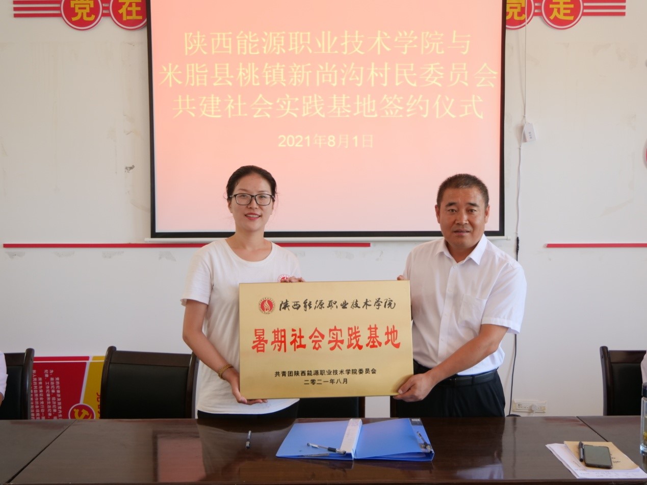 8月1日上午,陕西能源职业技术学院与米脂县桃镇新尚沟村村民委员会及米脂县米森农业发展有限公司在新尚沟村委会举行共建社会实践基地签约暨授牌仪式。新尚沟村第一驻村书记乔喜军、新尚沟村村支书、米森农业发展有限公司负责人、优秀校友任宏宇及村委会主要负责人、我校暑期社会实践带队教师景安琪、王倩及实践团成员参加仪式。本次仪式由暑期社会实践带队教师、智信学院学工办主任景安琪主持。