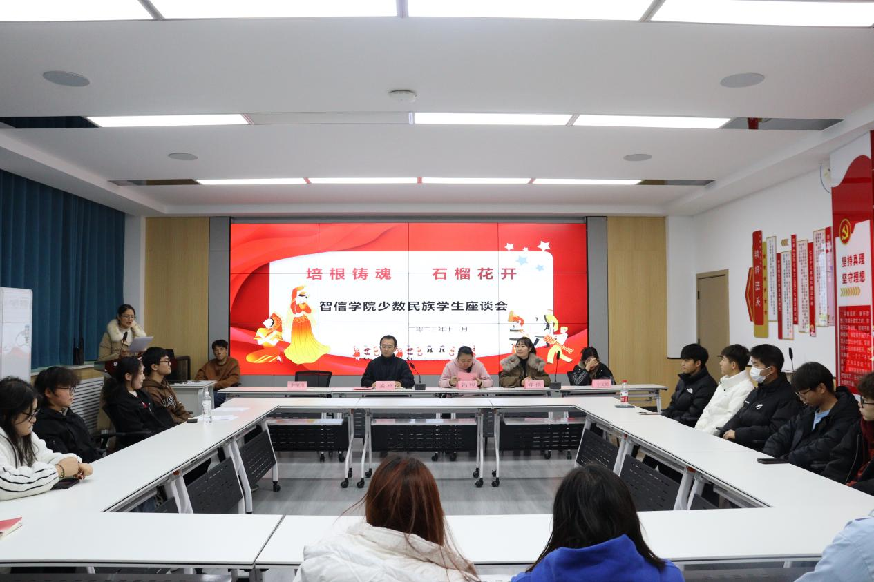 为贯彻落实党的二十大精神,全面加强铸牢中华民族共同体意识,促进各族学生交往交流交融,共居共学共事共乐,进一步了解少数民族学生在校学习生活情况,11月16日智能制造与信息工程学院在博约堂召开以“培根育魂 石榴花开”为主题的少数民族座谈会。旨在加强民族团结,共话民族情深。智信学院党总支副书记冯帅、副书记孟卓、学工办主任郑倩、辅导员王文婷以及少数民族学生参会,会议由辅导员尹艳玲主持。