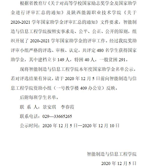 智信学院2020-2021学年国家助学金评选结果公示