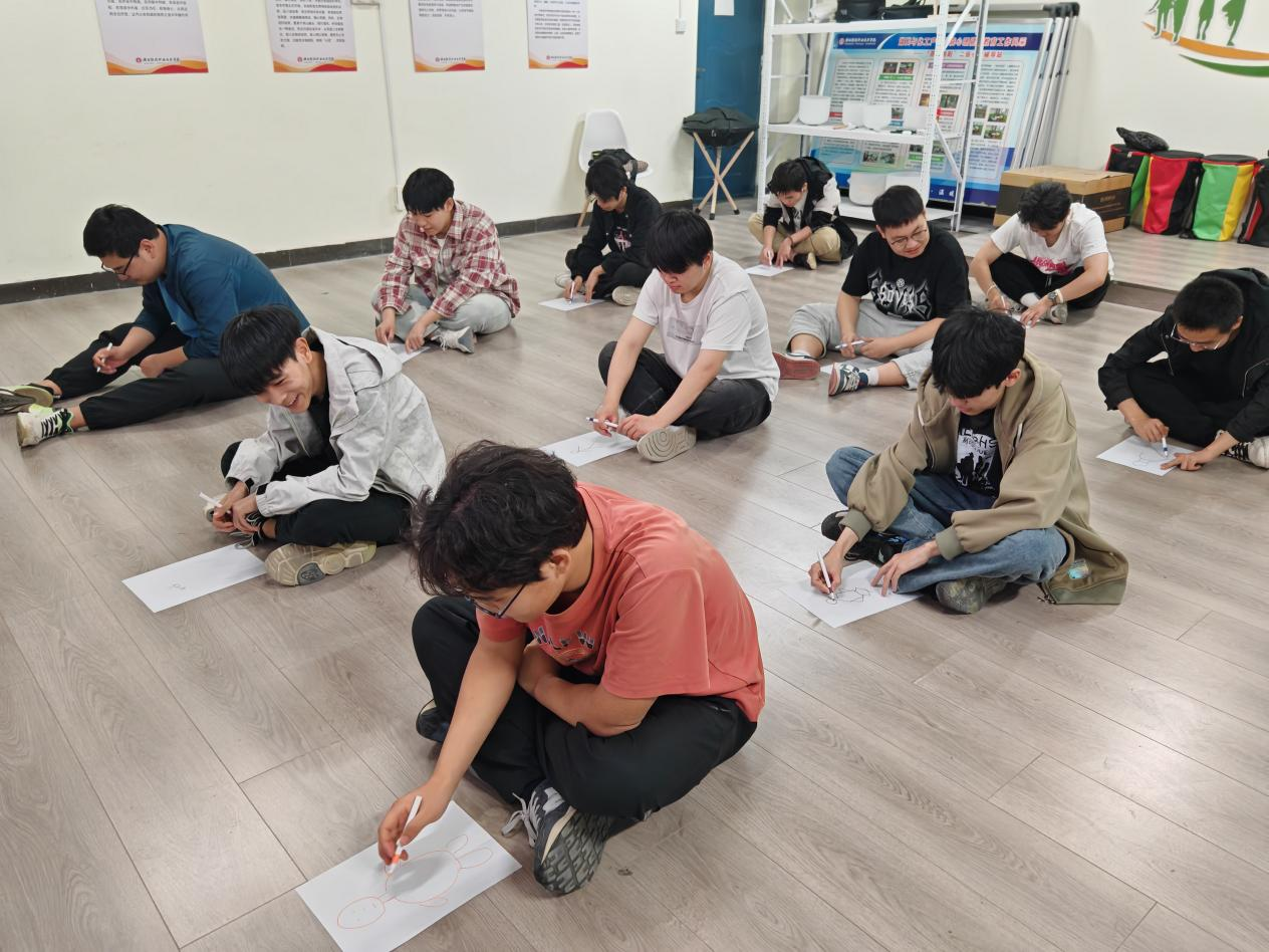 在实践环节,王老师引导同学们对当下的状态进行自我评估,鼓励大家用心感知此时此刻的情绪。紧接着,一场身体扫描练习展开。同学们在老师的指导下,平心静气,从头顶开始,逐步将注意力集中在身体的各个部位,仿佛进行一场细致入微的身体探索之旅。之后,同学们拿起手中的白纸和彩笔,在纸上勾勒出人的身体轮廓,并把自己对身体各部位的感知,用线条或色彩生动地描绘出来。这一独特的绘画过程,如同为同学们打开了一扇感知身体的大门,进一步加深了他们对自身身体的认知与理解。