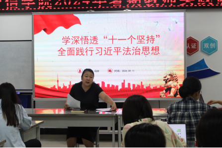 为提升广大师生法治素养,营造良好的法治校园环境,2024年9月11日下午在第一实训楼405,智信学院党总支副书记冯帅以《学深悟透“十一个坚持”全面践行习近平法治思想》为题,为全院教职工讲授专题党课。