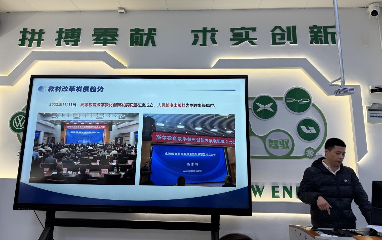 为积极响应国家教育数字化战略部署,系统提升教材建设质量与育人实效,12月24日,新型能源学院党总支教工党支部在第三实训楼207教室成功开展“金教材与数字教材建设”专题讲座。本次活动特邀人民邮电出版社李童泉担任主讲嘉宾,教工党支部全体教师党员积极参与。
