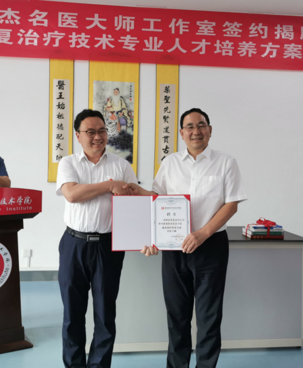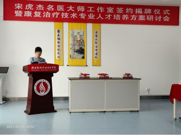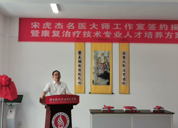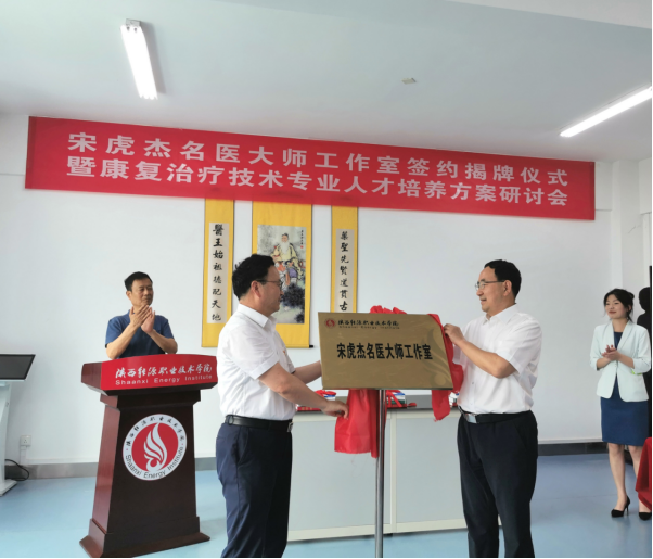 赵新法副校长与宋虎杰教授共同签订了《陕西能源职业技术学院宋虎杰名医大师工作室建设协议》,朱忠军校长与宋虎杰教授共同为名医大师工作室揭牌,同时朱校长为宋虎杰教授颁发了名医大师聘书。